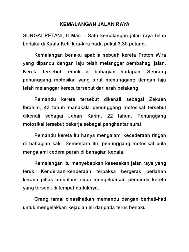 Contoh karangan kemalangan jalan raya. Contoh karangan bahasa melayu a faktor .